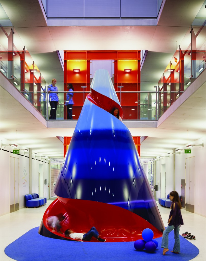It was designed as a, full of light and with a happy and fun atmosphere. Unlike classic hospitals with their long corridors and bland wards, it consists of a simple section of two long blocks flanking a central concourse which rises the full height of the building.