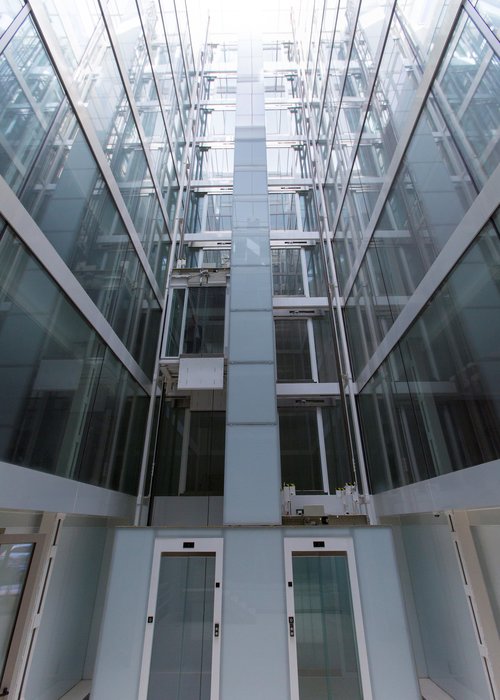 Acabado acristalado. Ascensores personalizados en hueco cerrrado parcialmente.