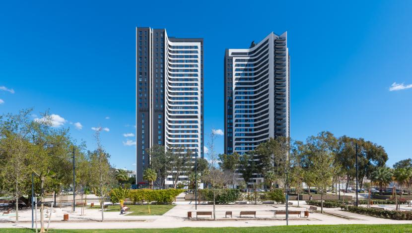 Las Torres Martiricos se alzan como dos referentes del nuevo skyline de Málaga, combinando usos residenciales y hoteleros en un conjunto vertical de carácter contemporáneo.