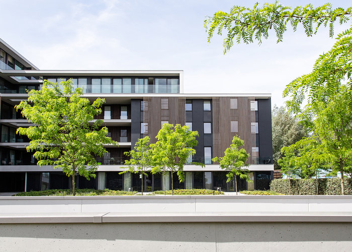 Le bâtiment a été conçu dans le respect de la Lys, il est en forme de L,et est orienté de telle sorte que vous puissiez pleinement profiter du soleil et de l'étendue de l'eau.