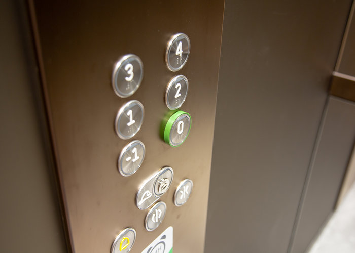 6 ascenseurs publics, type Orona Next Essentia: 5 arrêts, 8 personnes, 630 kg, cage en verre Matelac et acier inox bronzé.