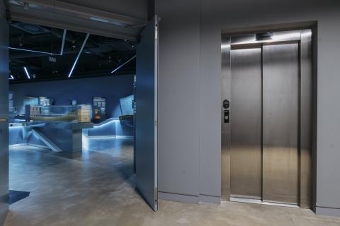 O elevador, com um design robusto e discreto em aço inoxidável, adapta-se à estética industrial e científica do museu, permitindo o fluxo contínuo de visitantes entre as diferentes salas imersivas. O seu funcionamento silencioso e fiável assegura que a narrativa do museu não seja interrompida, mantendo a continuidade de uma visita que combina conhecimento, emoção e impacto visual.